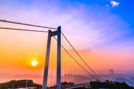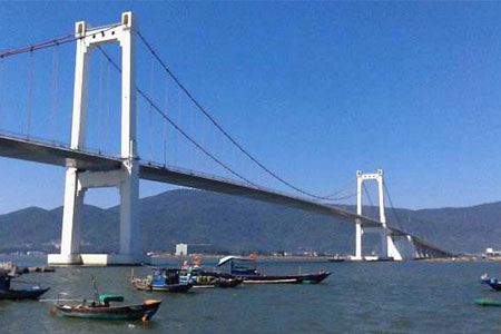 越南峴港順福大橋?yàn)槿邕B續(xù)鋼箱加勁梁懸索橋,主跨405米、全長1856米,...