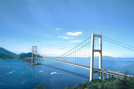 浙江岱山縣秀山大橋?yàn)槿L3063米,主橋?yàn)榭鐝?26米的雙塔鋼箱梁懸索橋,按雙向...