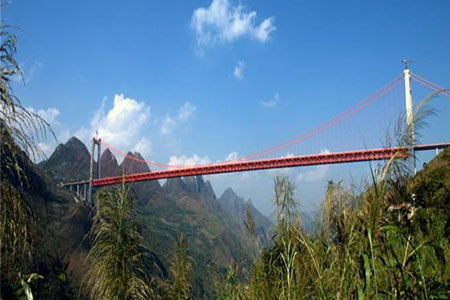 貴州北盤江大橋主跨636米單跨雙鉸、鋼桁加勁梁懸索橋,大橋全長1020米,是貴州...