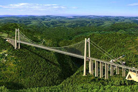 貴州壩陵河大橋主橋?yàn)?088米鋼桁架懸索橋,橋梁全長2237米,東岸引橋長940...