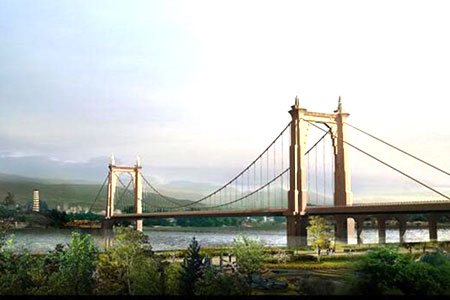 大沙水道橋?yàn)橹骺?200米雙塔單跨鋼箱梁懸索橋。...