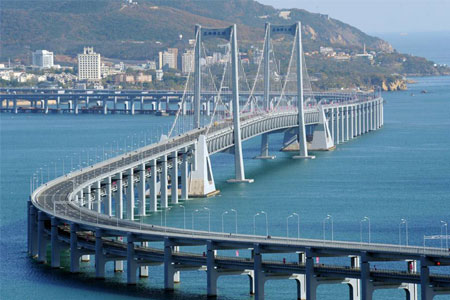 大連星海灣大橋?yàn)槿绲劐^式懸索橋,全長820m,其中主跨460m。大連星海...